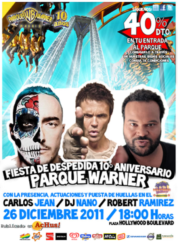 Carlos Jean, DJ Nano y Robert Ramírez darán las Campanadas de fin de año con los Looney Tunes y tendrán su estrella en el Paseo de la Fama. El próximo lunes día 26 de diciembre a las 18.30h, el productor musical Carlos Jean, el artista musical DJ Nano y el cantante Robert Ramírez dejarán sus huellas en el Paseo de la Fama de Parque Warner en reconocimiento y homenaje a sus trayectorias profesionales.También serán los encargados de despedir el 10º Aniversario de Parque Warner y el fin de año con una cuenta atrás muy especial… “las palomitas de la suerte de Bugs Bunny” en vez de las populares uvas, serán ricos copos de maíz los que han de comerse para recibir el año próximo cargado de ilusiones…! Carlos Jean, DJ Nano y Robert Ramírez aparecerán de manera estelar sobre el escenario de la Plaza de la Bienvenida de Hollywood Boulevard, arropados por los queridos Looney Tunes, para plasmar sus manos y firmas sobre el cemento de las estrellas del Paseo de la Fama, al igual que ya hicieron en su día el actor y director Santiago Segura, el actor Mario Casas, la cantante Pastora Soler, el periodista Máxim Huerta, el cantante Diego Martín, el comunicador Joaquín Prat, el periodista Premio Ondas Juan Ramón Lucas, la modelo Sandra Ibarra, el campeón de natación de larga distancia David Meca y la reina del dance-pop español Soraya Arnelas. Para todos los visitantes y fans interesados en disfrutar de esta marchosa y navideña fiesta para despedir la temporada, habrá un descuento del 40% para dos personas al que se podrá acceder SÓLO a través de nuestras Redes Sociales. También descuento para desempleados del 40% (el interesado y hasta 3 acompañantes) aún vigente (ofertas no acumulables). Será un día muy especial en Parque Warner donde los invitados, acompañantes y visitantes podrán disfrutar de la magia, de las atracciones y de todos los espectáculos de la Navidad de Parque Warner durante todo el día, se podrá aprovechar la oportunidad de reconocer y premiar las magníficas carreras profesionales del productor musical Carlos Jean, el artista musical DJ Nano y el cantante Robert Ramírez, y disfrutar de la mejor y más marchosa fiesta de clausura del 10º Aniversario de Parque Warner durante estas fechas navideñas. ![]() Parques temáticos te presenta toda la actualidad que acontece a los parques de diversiones, zoos y de ocio en general de todo el mundo, esta noticia esta archivada en la sección de Parque Warner Madrid del año 2011, donde te presentamos todas las novedades de Parque Warner Madrid que acontecen esta temporada. |